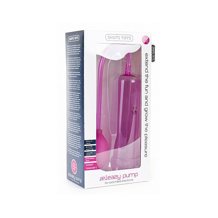 Releazy Pump, firmata Shots Toys, vi dará il piacere, la misura e la confidenza in voi stessi che avete sempre sognato! Ogni qualvolta schiaccerete la pallina della pressione, la vostra erezione diventerá piú intensa e piú forte. L’apertura é realizzata in morbido silicone, che non urterá o irriterá il pene durante queste potenti erezioni. Il tubo é trasparente, permettendovi di vedere al suo interno mentre lo il vostro pene crescerá. Rimuovete la pressione dal cilindro, togliendo il dito dal foro di ventilazione. Quando avete finito, rimuovete la guaina dal cilindro e detergete il tutto con un buon pulitore per giochi e acqua calda.