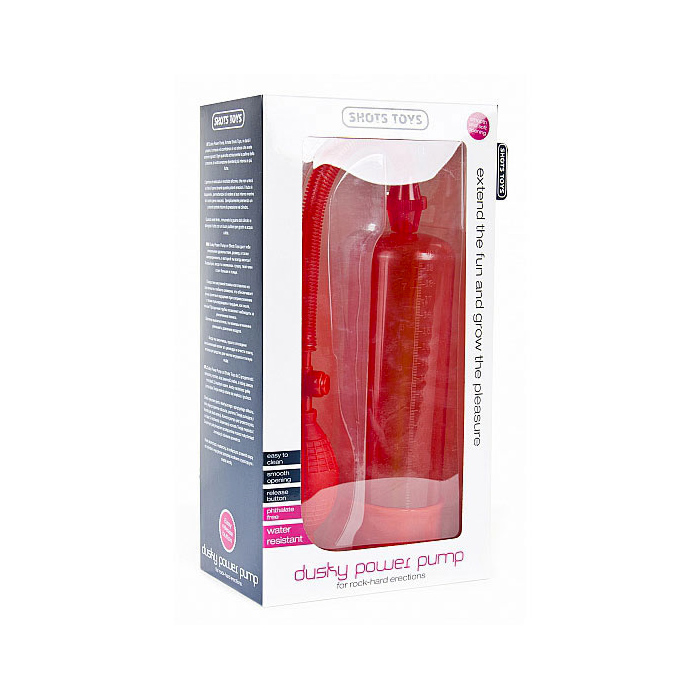 Dusky Power Pump, firmata Shots Toys, vi dará il piacere, la misura e la confidenza in voi stessi che avete sempre sognato! Ogni qualvolta schiaccerete la pallina della pressione, la vostra erezione diventerá piú intensa e più forte. L’apertura é realizzata in morbido silicone, che non urterà o irriterá il pene durante queste potenti erezioni. Il tubo é trasparente , permettendovi di vedere al suo interno mentre lo il vostro pene crescerá. Semplicemente premendo un pulsante potrete ridurre la pressione nel cilindro. Quando avete finito , rimuovete la guaina dal cilindro e detergete il tutto con un buon pulitore per giochi e acqua calda.