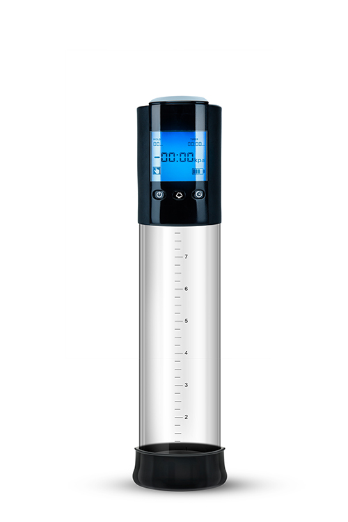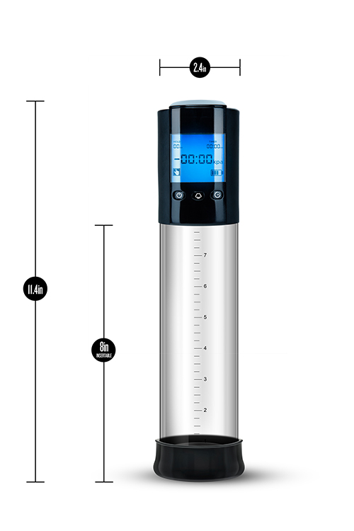 Automatic penis pump. Detachable crystal clear cylinder. Customize and set pressure and time levels. USB rechargeable. Up your game and heighten your sensations with the automatic Performance Smart Pump. Featuring memory intelligence, allowing you to set and save your favorite sensations. Measure your experience with a digital screen-- displaying time and kPa units of pressure. Your Smart Pump also features a crystal-clear sleeve with an etched ruler, allowing you to easily see your gains as they happen. Fully automatic, push button controls allow for one-handed play. Expect an airtight cylinder, automatic pressure, easy quick release button, and USB rechargeable. Instruction manual included.