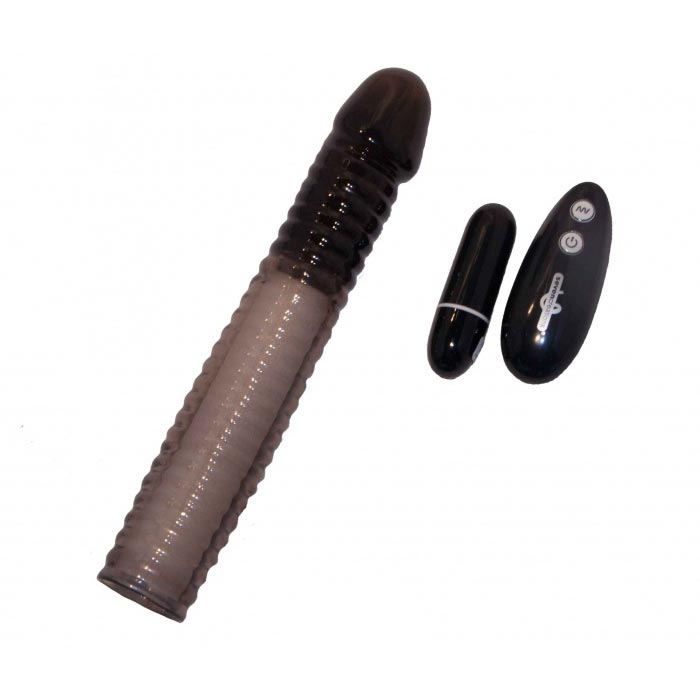 Guaina estensore fallico, ricoperta su tutta la lunghezza di protuberanze stimolanti che stimoleranno le pareti della vagina o dell'ano del partner. All'interno, proprio all'altezza del glande, potrai inserire il piccolo vibratore in dotazione, controllabile tramite il telecomando in dotazione, per vivere una doppia stimolazione. Facile da rimuovere e detergere.