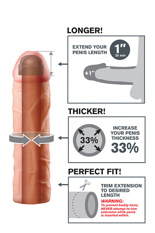 Developed as a safe, affordable, non-surgical alternative to expensive medical procedures and pills, your Fantasy X-tension will give you the biggest, thickest, most satisfying pleasure penis. It will give \u00A01\" Extension and adds 33% more girth. It is made of Ultra-lifelike Fanta Flesh. You can trim it for a perfect fit and it is phthalate free. It includes free lube and toy cleaner"