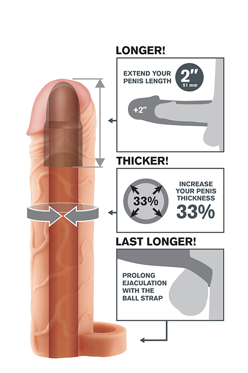 Developed as a safe, affordable, non-surgical alternative to expensive medical procedures and pills, your Fantasy X-tension will give you the biggest, thickest, most satisfying pleasure penis. It will give a ? (51mm) Extension and adds 33% more girth. It is made of Ultra Lifelike Fanta Flesh. The ball strap prolongs ejaculation and holds extension in place. It is phthalate free and includes free lube and toy cleaner.\u00A0