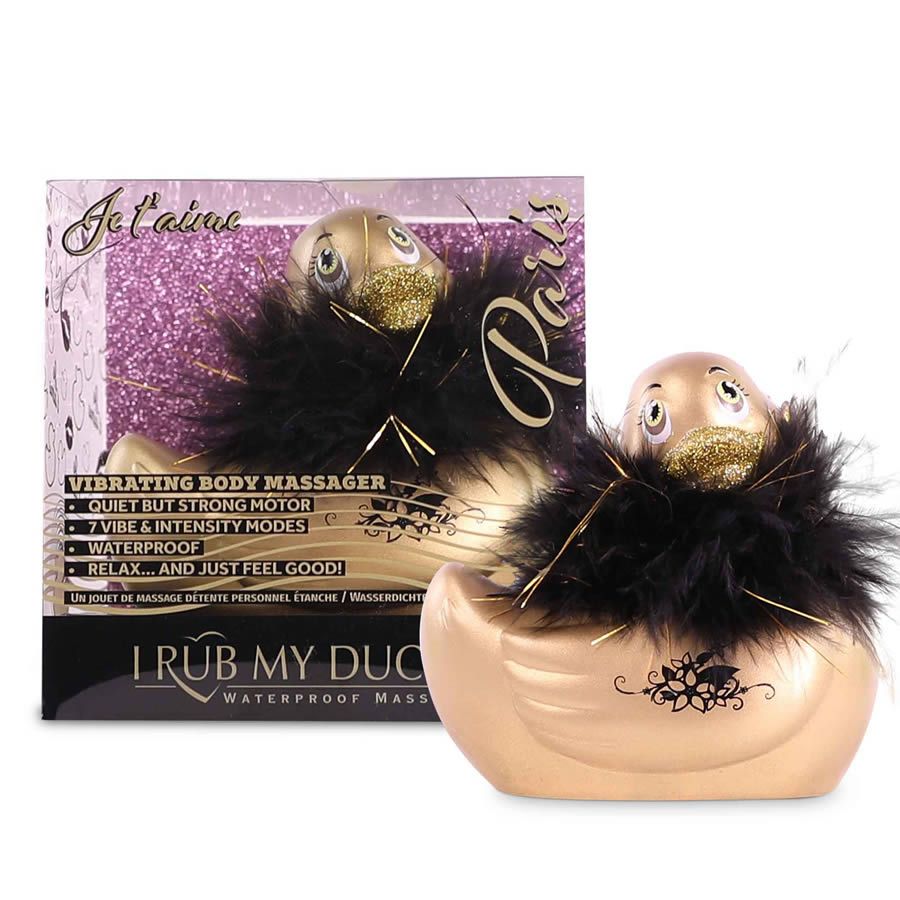 Splendida Duckie 2.0, colore oro, la collezione I Rub My Duckie 2.0 ti porta nella città dell'amore. Con il Il suo bellissimo boa rimovibile, morbido e solleticante sulla tua pelle, e potenti vibrazioni di questo massaggiatore saranno un piacere per il tuo corpo e ti doneranno una sensazione di rilassamento. Potrai utilizzarla anche sotto la doccia o nella vasca da bagno, la papera vibrante Duckie 2.0 è impermeabile.
