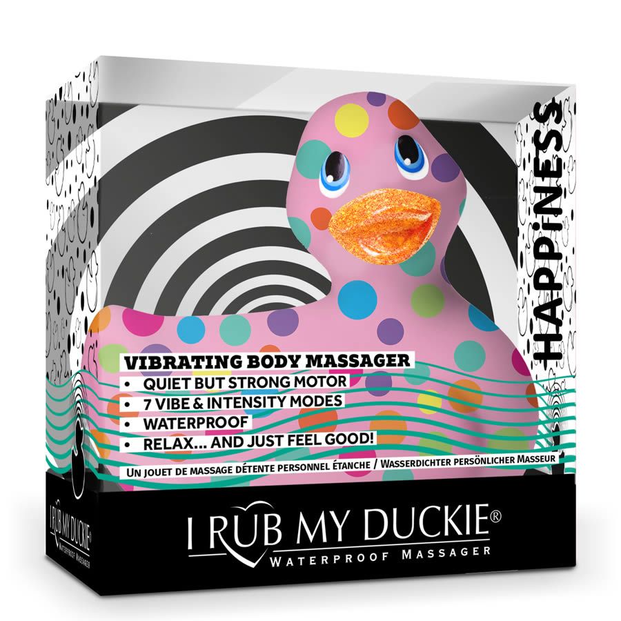 Splendida Duckie 2.0, colore rosa e piccoli disegni a forma circolare (pallini) multicolore, la collezione I Rub My Duckie 2.0 ti porta nella città dell'amore. Le potenti vibrazioni di questo massaggiatore sono un piacere per il tuo corpo e ti doneranno una sensazione di rilassamento. Potrai utilizzarla anche sotto la doccia o nella vasca da bagno, la papera vibrante Duckie 2.0 è impermeabile.