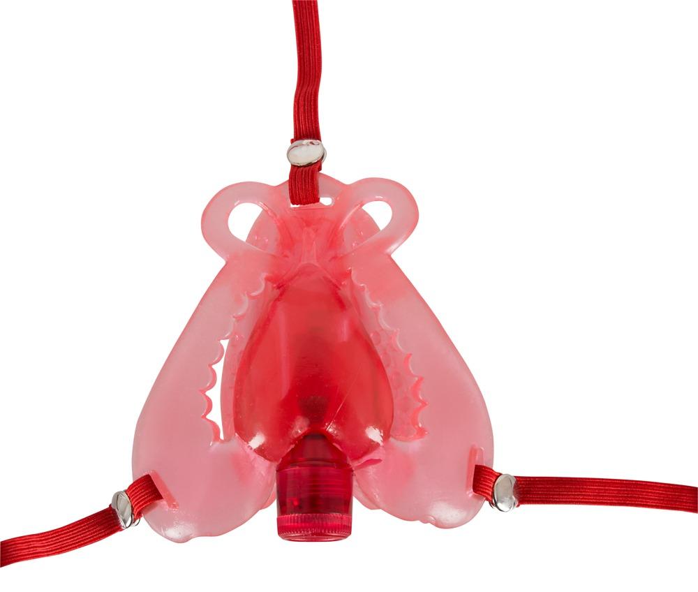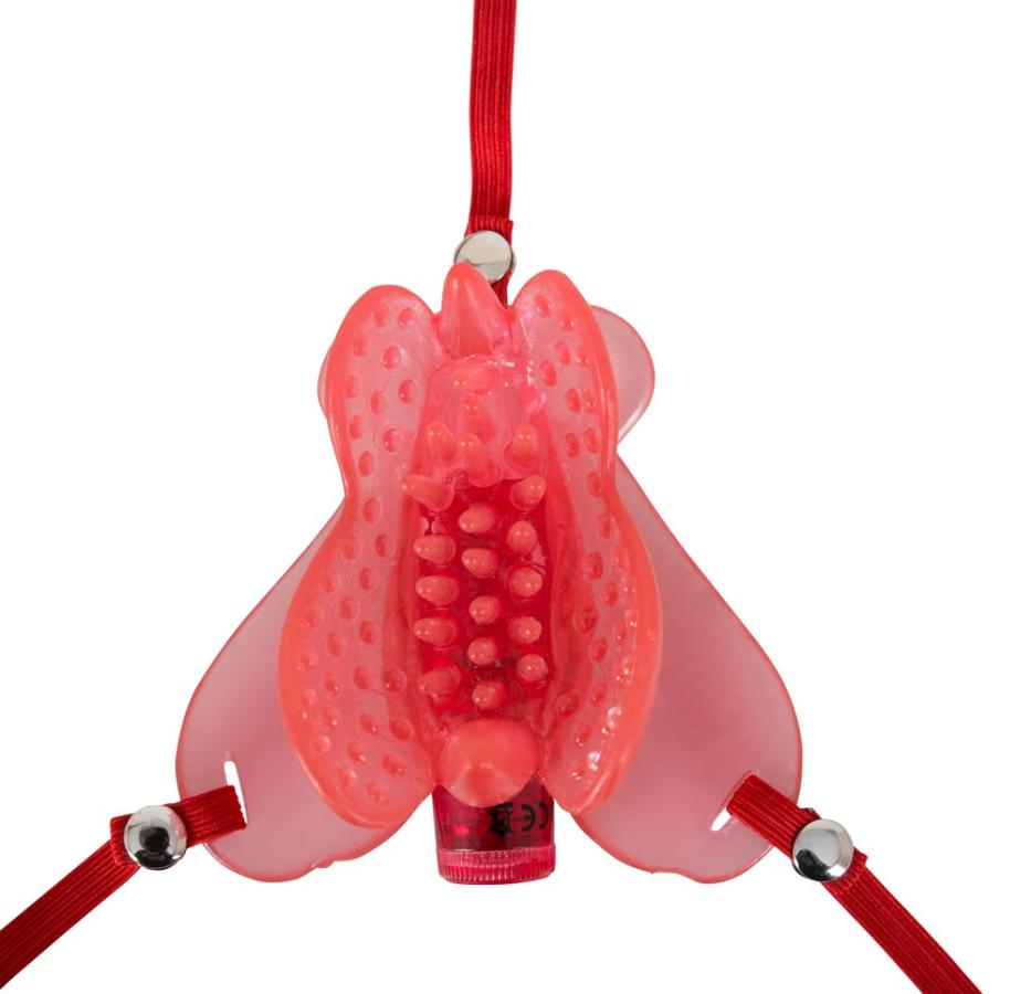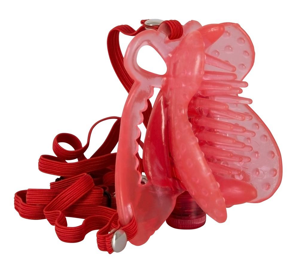 Stimola il germoglio intimo!Cinturino a farfalla rosa con vibrazione a più velocità, regolabile sul pratico regolatore di stimolazione. Spalline elastiche regolabili. Rosa. 8,5 cm di lunghezza, fino a 8,8 cm di larghezza. Materiale: TPR (farfalla), ABS, metallo (rivetti), PP (fibbie). Comprese le batterie a bottone.