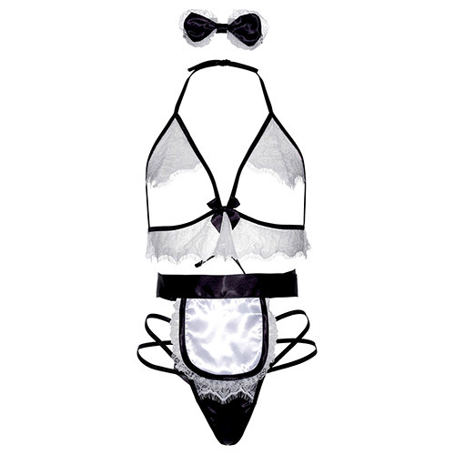 Accattivante coordinato per vestire i panni di una cameriera dal sex appeal irresisitibile! Tessuto nero satin con delicati inserti in pizzo bianco per il reggiseno aperto ed il perizoma. Abbinati ad essi sono inclusi, un grazioso cerchietto con fiocco ed un mini grembiulino... Un'idea stuzzicante per sedurre con successo assicurato! Misura unica calzabile dalla taglia 40 alla taglia 46. (Calze non incluse).