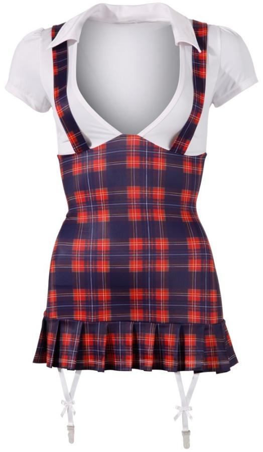 Become a school girl!This mini dress is the perfect uniform. The top part is a low cut white blouse with short sleeves and a collar. There is also a sewn-on blue/red chequered skirt part and its straps go over the boobs and criss-cross at the back. With a short pleated hem and two white suspender straps at the front. Material: 92% polyester, 8% elastane.