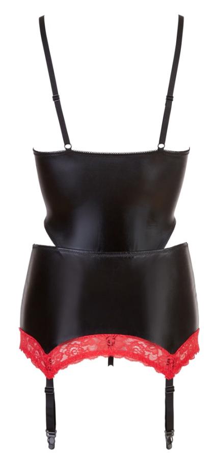 Two sexy pieces of clothing that also look great when worn together! This body is extremely hot: the breasts can be revealed in the blink of an eye, thanks to the snap hooks and it is invitingly open in the crotch area as well… The opaque cups and the saucy skirt with suspender straps that hold up sexy stockings make this sophisticated duo the perfect club outfit for those who are brave enough to show off what they’ve got!Shiny black wetlook with red lace. With adjustable bra and suspender straps. 92% polyester, 8% elastane. Without stockings.