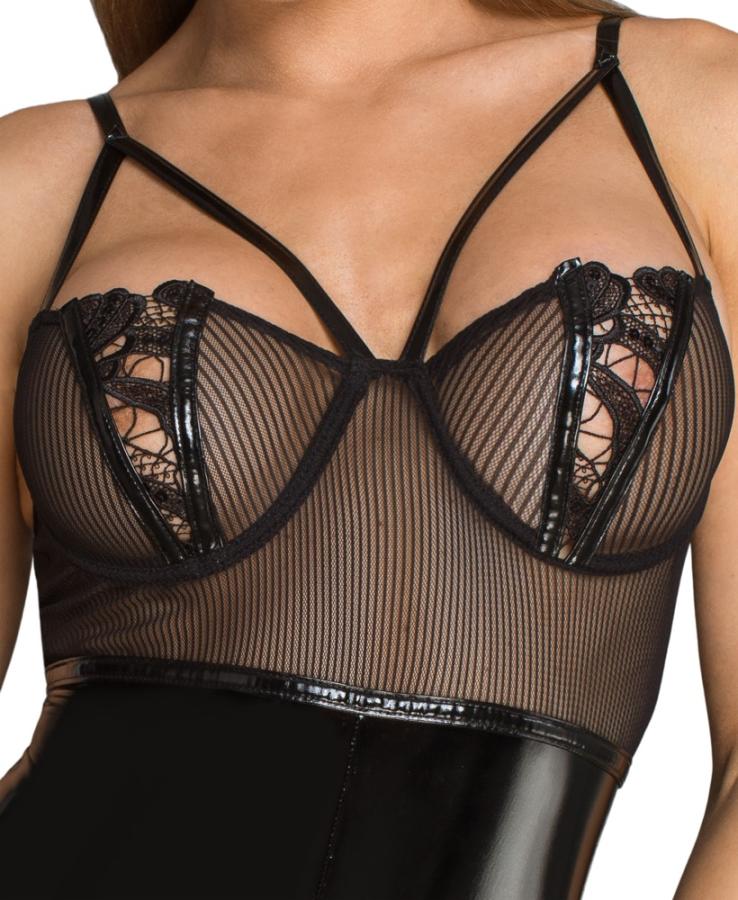 Mozzafiato sexy con dettagli amorevoli!Corpo stravagante con coppe con ferretto ricamato, scollatura a gamba alta e cerniera a due vie nel cavallo e cerniera supplementare nella parte posteriore. Realizzato in tessuto a rete a righe semitrasparenti abbinato a vinile lucido. Inclusi i dettagli del cinturino nel décolleté e le strisce decorative in vinile.80% poliammide, 20% elastan, rivestimento in poliuretano; materiale mesh 92% poliammide, 8% elastan.Attenzione, il Noir ha una tabella delle dimensioni a parte!