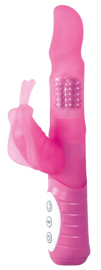 Le donne lo ameranno!Vibratore a perla rosa con 7 ritmi di vibrazione e braccio di stimolazione del clitoride a forma di farfalla. Lunghezza totale 22 cm, profondità di inserimento 11 cm. Ø 3,5 cm. Funzioni regolabili separatamente con la semplice pressione di un tasto. Materiale: silicone, ABS. (Si prega di ordinare le batterie separatamente: 3 x Micro/AAAA)