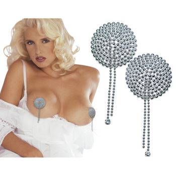 COPRI CAPEZZOLI ARGENTATI CON PENDENTI. Copricapezzoli con perline argentate e due catene pendenti per uno stile mozzafiato e in continuo movimento. L'adesivo sul retro assicura una tenuta stabile e duratura! Diametro 4 cm