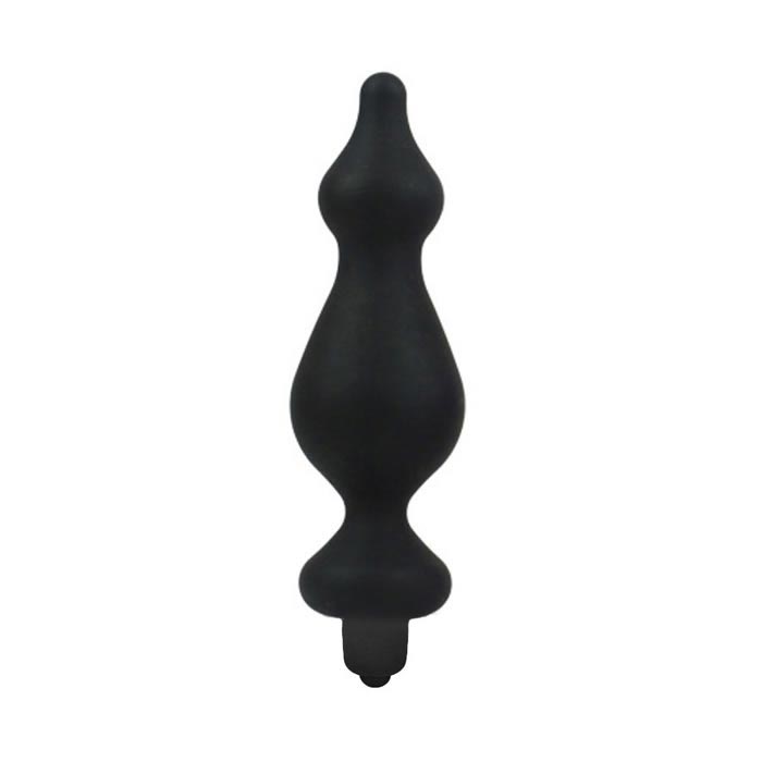 Black beaded plug made of silicone in connected to a cock ring. Total length 10 cm, plug ø 1.9-3.9 cm. Material: silicone, phthalate-free according to EU Regulation REACH.