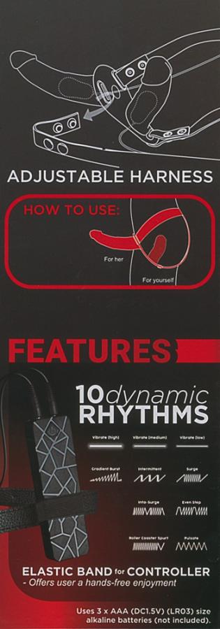 Just strap it on and enjoy even more fun with your partner! • Strap-on vibrator with 2 vibrators• Penetration for both people • Perfect for role play• The harness can be adjusted Both people will be able to enjoy this strap-on because two vibrators are attached to it – there is a large outer vibrator and a small inner vibrator. The large vibrator (17 cm long, Ø 3-4.3 cm) is slightly curved and is used for penetrating a partner (the passive one). The small vibrator (9.3 cm long, Ø 3.8-4.2 cm) penetrates the person wearing the harness (the active one). Both vibrators have bulging glans, pronounced veins and 10 vibration modes that can be controlled with the remote control on a wire. The remote control can be placed into the small loop on the harness so that the hands are free to do other things. There are 12 holes in the harness so that the circumference can be adjusted from 78 cm to 108 cm. The string is 96 cm long and can be adjusted to fit. Material: silicone, ABS, PU. Please order batteries separately: 3 x Micro/AAA.