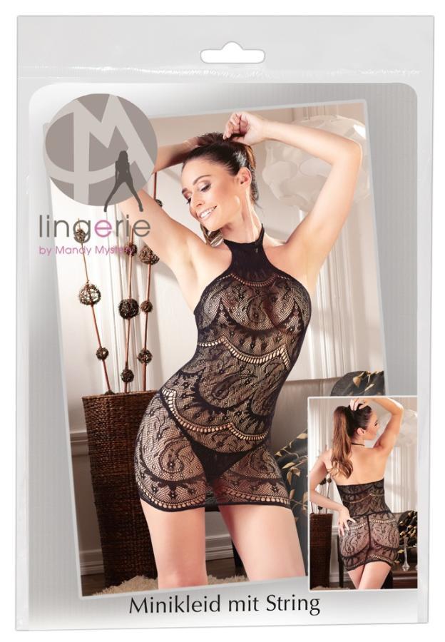 Mini dress nero molto sexy per donne dalle forme morbide, realizzato in similpelle e pizzo motivo floreale.