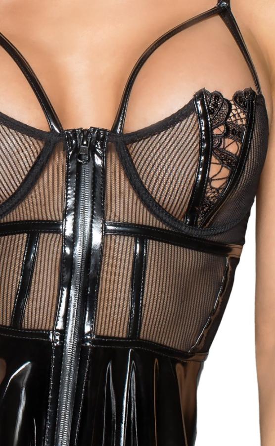 Per notti selvagge (di festa)!Abito bustier semi-trasparente a righe con appendino sagomato, cinturini in vinile regolabili e dettagli del cinturino. Con gonna corta e svasata in vinile lucido. Nobili ricami sulle coppe, rinforzi decorativi in vinile e una cerniera a tutta lunghezza sul davanti rendono il look sexy perfetto.80% poliammide, 20% elastan, rivestimento in poliuretano; materiale mesh 92% poliammide, 8% elastan.Attenzione, il Noir ha una tabella delle dimensioni a parte!