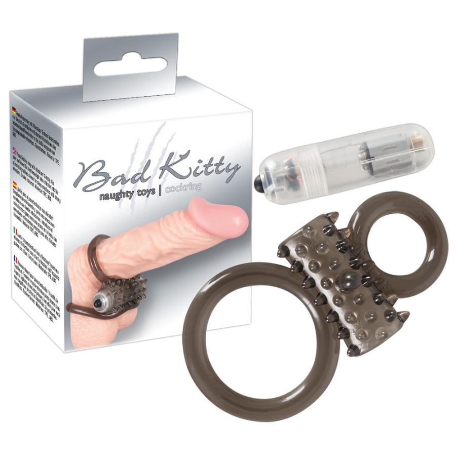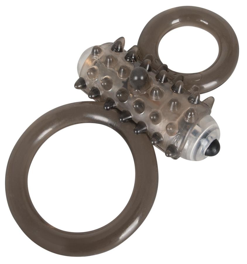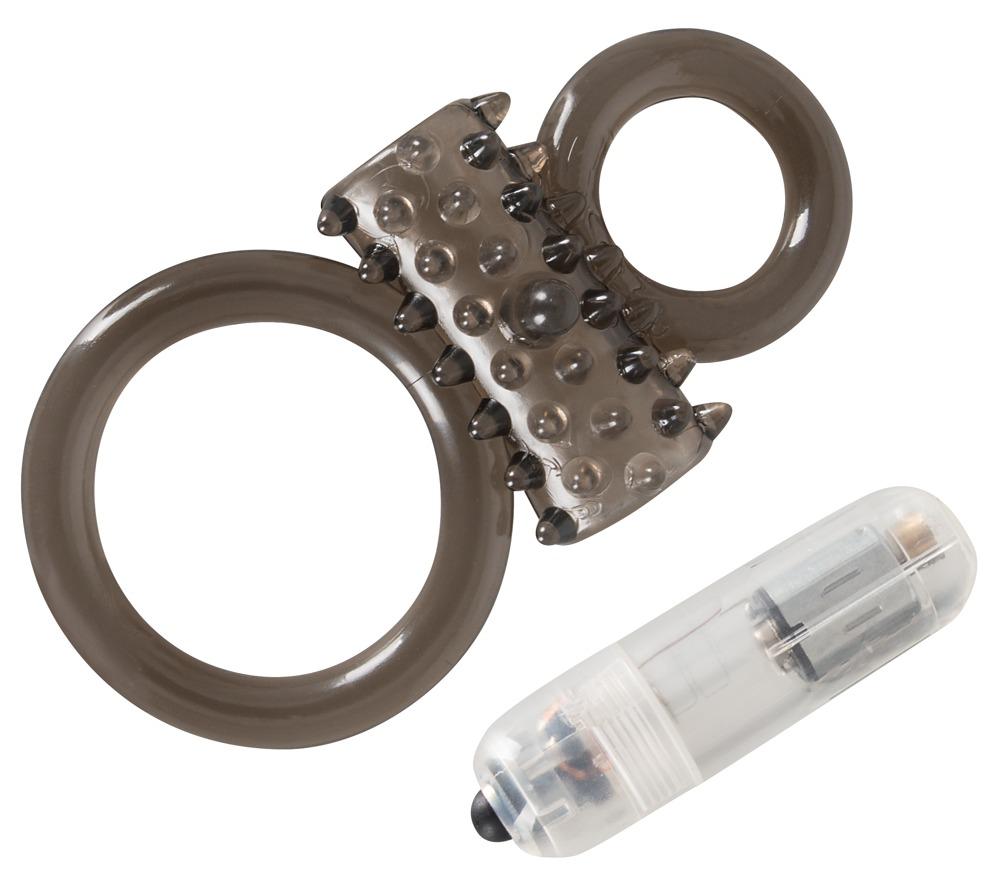 With vibration!Smoke-colored penis/testicle ring with a space for the included vibro-bullet. The vibro-bullet has 1 vibration level. With dots for clitoris stimulation during sex. Complete length approx. 11 cm, Ø of cock ring 2.2 cm, Ø of testicle ring 3.9 cm (both rings are flexible). Material: TPE, ABS. Includes batteries.