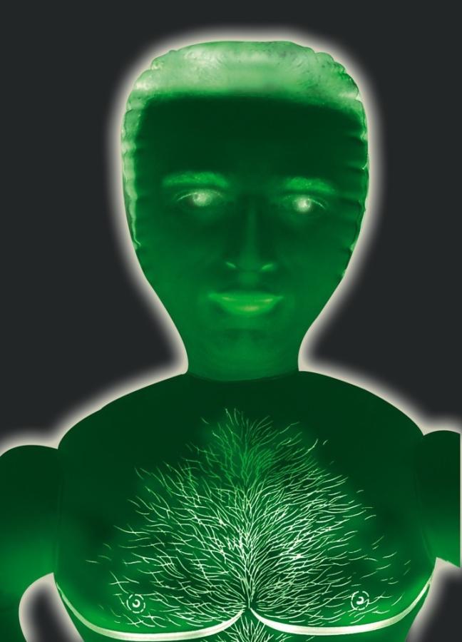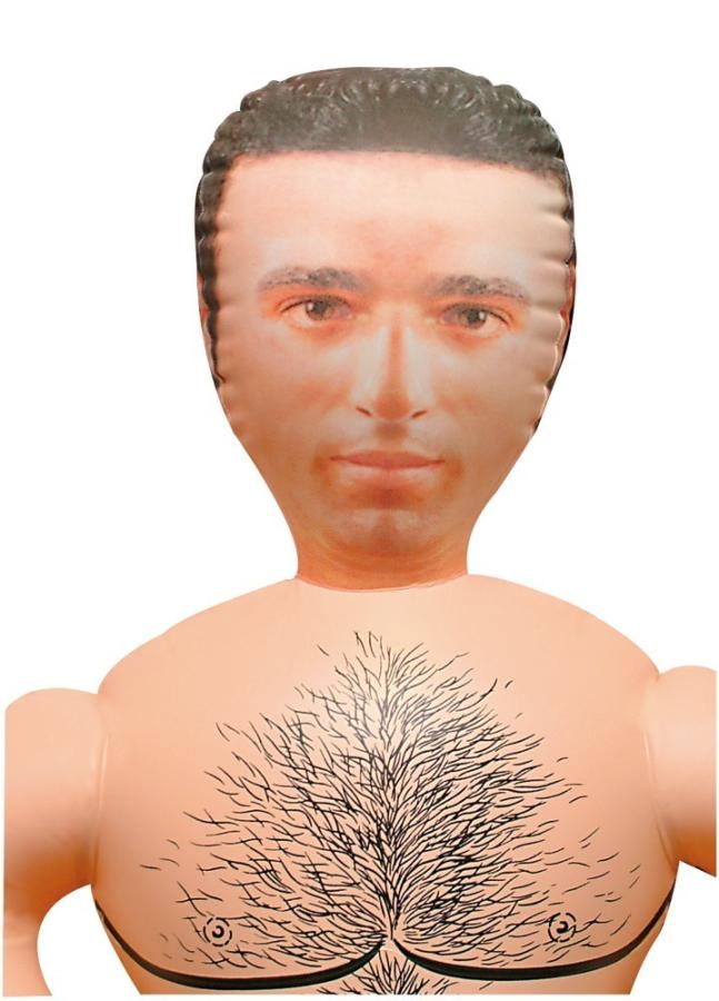 Uomo gonfiabile con viso stampato senza apertura del piacere, capelli e peli sul petto, che si illumina al buio. Pene gonfiabile lungo 17,5 cm. Gonfiabile ad altezza uomo (ca. 1,60 m) e di PVC.