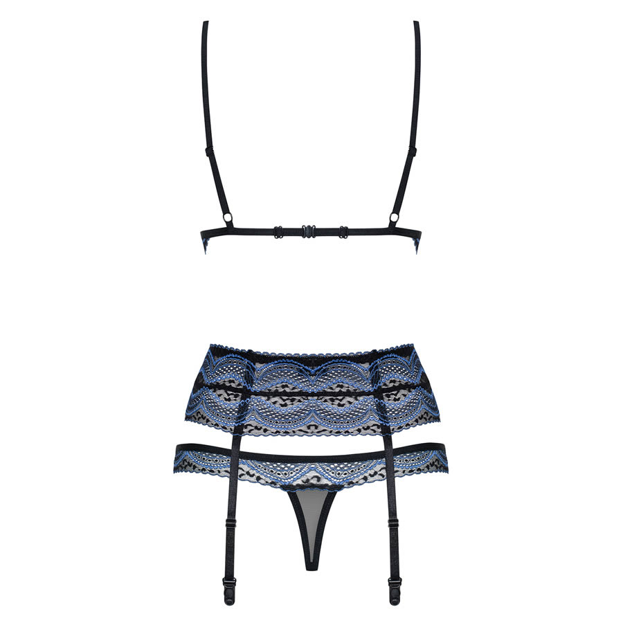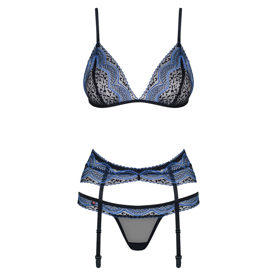 - three-piece, lacy set with sapphire adornment and tiny spots