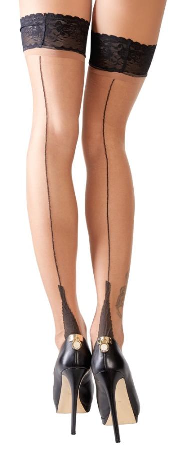 Calze autoreggenti, con rinforzo in silicone per una tenuta antiscivolo e con balza in pizzo nero, cucitura nera che corre