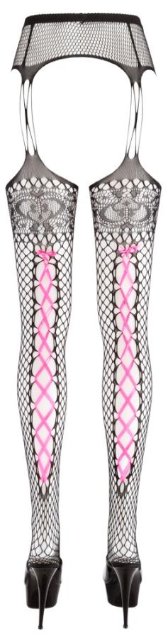 Pure pleasure for your legs!Stockings and suspender belts in one with a tempting open crotch - perfect for a quicky! Pink ribbon at the back (included). Black. 90% polyamide, 10% elastane.