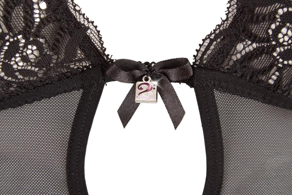 Show off your beautiful assets!This sexy set is extremely irresistible. The sweet powernet basque has cups that are made out of beautiful lace and lace on the hem. The small bow and pendant between the cups are really eye-catching. The bra and four suspender straps are adjustable. The matching string is made entirely out of lace and is invitingly open in the crotch area… Black. 90% polyamide, 10% elastane.