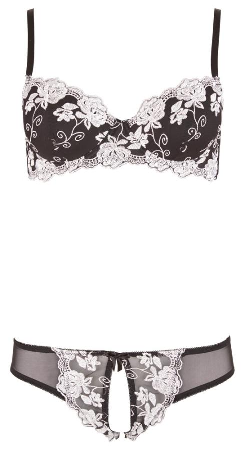 Delicate white embroidery on top of black material.The beautiful bra and briefs with a provocative slit at the front are extremely feminine, however they are also slightly cheeky as well. Is this the perfect set for you? Then start dreaming about the day when you are wearing this set and lying on the bed seducing your partner…Bra with slightly padded cups, adjustable straps and a hook fastener at the back. The briefs are completely open in the crotch area. Main material (powernet): 90% polyamide, 10% elastane. Embroidery: 60% polyamide, 40% viscose.