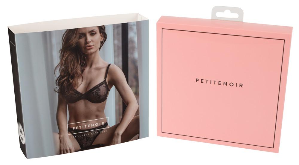 Tentazione femminile!Reggiseno e perizoma in pizzo abbinato a velluto. Dettagli in metallo color oro. Il reggiseno ha una chiusura a gancio sul retro e spalline elastiche regolabili e persino completamente rimovibili. Il perizoma è realizzato in Powernet a doppio strato sul retro.Pizzo 95% poliammide, 5% elastan; powernet 93% poliammide, 7% elastan.Attenzione: Petitenoir ha una tabella di dimensioni a parte!