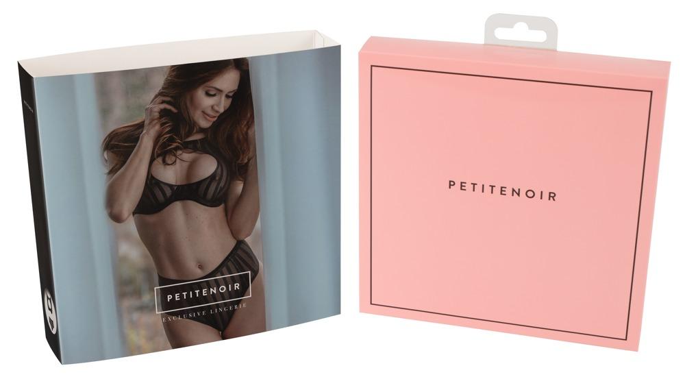 Comfortable and breathtakingly sexy!Underwired bra and briefs in a seductive set made of elastic stripes material. The bra features bones, an artful cut-out in the front, elastic and adjustable velvet straps and a hook and loop fastener in the back. The briefs are waist-high. 70% polyamide, 30% elastane.Attention: Petitenoir has a separate size chart.