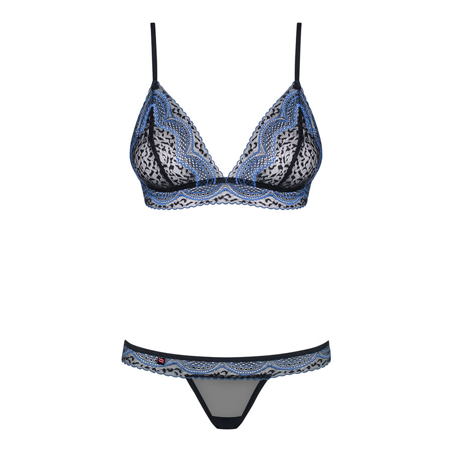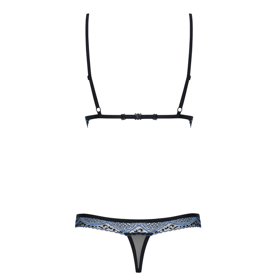 - lacy, two-piece set with sapphire adornment and tiny spots