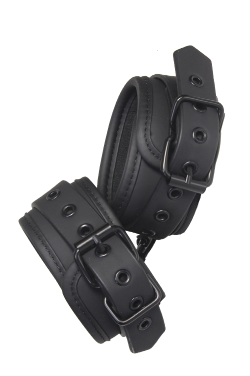 Stylish cuffs. Fully adjustable via the simple belt style buckle. Held together by a black chain that you can easily attach rope, hooks or weights to. These durable cuffs feature all black nickel free hardware and are lined in a soft yet durable neoprene material for sexy and comfortable play. A pair of stylish black ankle cuffs with all black nickel free hardware and lined in a soft yet durable neoprene material for sexy and comfortable play. The ankle cuffs are fully adjustable with the simple belt style buckles. A 12 cm long chain keeps the cuffs together. The chain is detachable on one side with a musketon hook. It is possible to attach more chains or rope hooks, or extra weights.