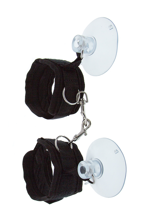 Handcuffs with big strong suction cups and Velcro closure.From the Guilty Pleasure bondage collection.The wrist restraints each have a metal musketon hook, to attach them to each other, or to other BDSM items.