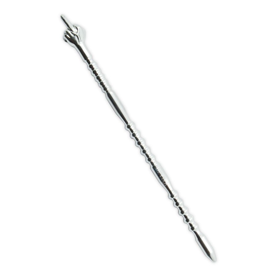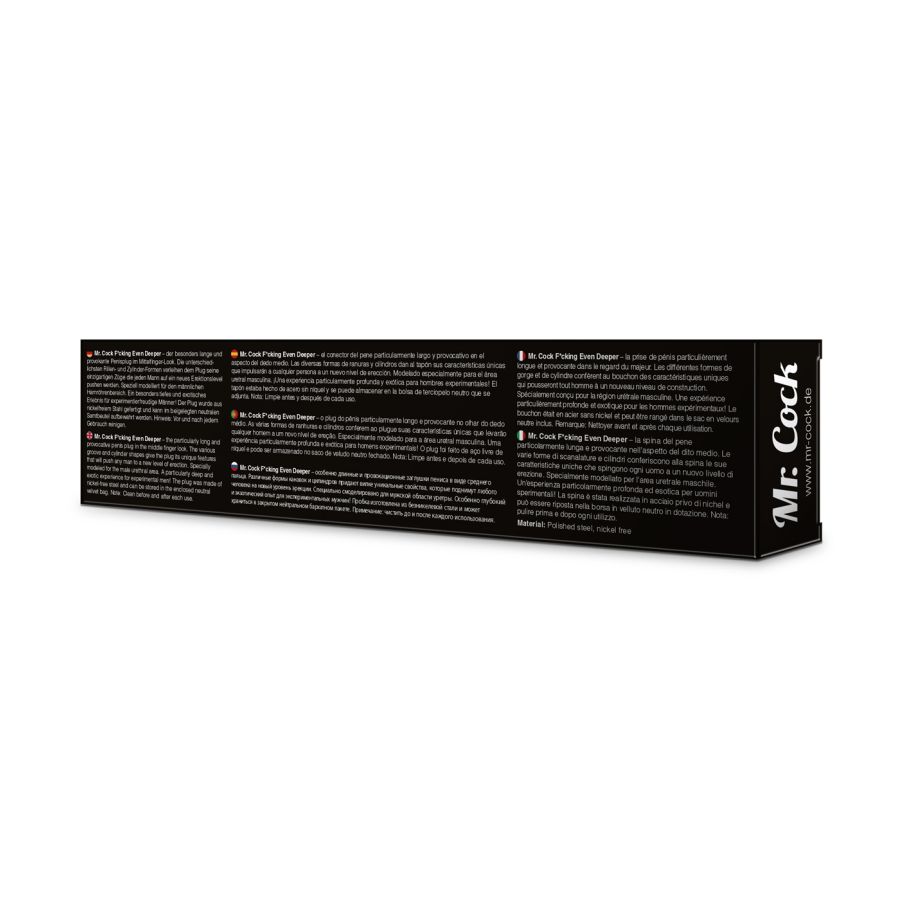 Mr. Cock F*cking Even Deeper - Il plug per il pene particolarmente lungo e provocatorio nell'aspetto del dito medio. Le varie forme di scanalature e cilindri conferiscono al plug le sue caratteristiche uniche che spingono ogni uomo a un nuovo livello di erezione. Modellato appositamente per l'area uretrale maschile. Un'esperienza particolarmente profonda ed esotica per uomini che amano sperimentare! Il plug è realizzato in acciaio privo di nichel e può essere riposta nella custodia in velluto neutro inclusa.