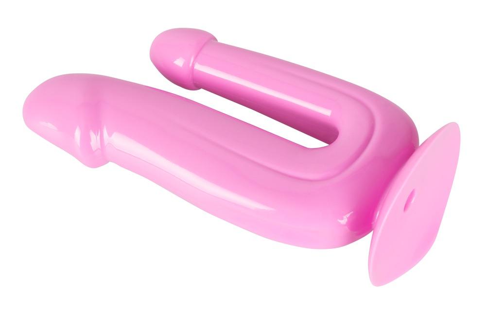 Double penetration!Pink double dildo with a handy suction cup. The vaginal arm has slight glans and the anal arm has a rounded head. The slightly flat dildo is extremely fulfilling, very flexible and has a stimulating groove on the shaft. Complete length 17.5 cm, insertion depth 13.5 cm (vaginal arm), 10 cm (anal arm), Ø max. 4.2 cm (vaginal arm), max. 2.8 cm (anal arm). PVC.