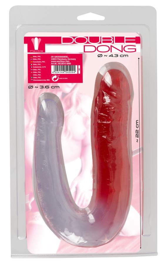 Per il piacere solitario o giochi di coppia!Bellissimo dildo flessibile doppio in look pene con ghianda ad ogni estremità. Lunghezza totale 32 cm, Ø 3,1 (dildo trasparente) a 4,3 cm (dildo rosso).PVC.