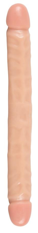 Il più felice per il fronte e il retro!Dildo doppio estremamente flessibile con ghiande e venature particolari. Può essere usato sia vaginale che anale allo stesso tempo.Lunghezza totale 33,1 cm, Ø 3,8 cm. PVC.
