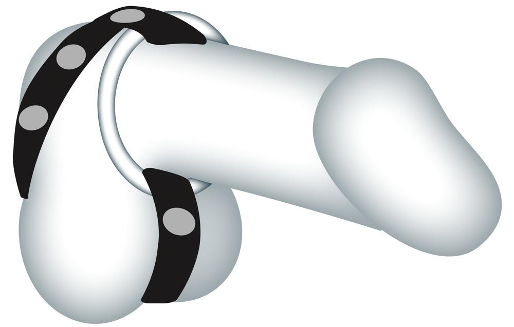 Cinghia di pelle regolabile con borchie decorative e tra anelli per pene metallici sostituibili: Ø 3 cm, Ø 3,5 cm e Ø 4 cm. Nero/argento. Materiale: pelle crosta, metallo.