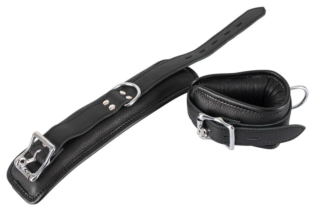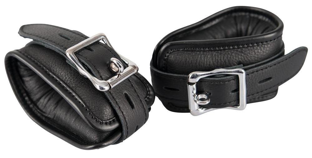Extremely softly padded handcuffs made that are made entirely out of leather!These black handcuffs feel wonderfully soft against your skin and you might even forget that you are being punished!The buckle fasteners mean that you can adjust the circumference from 22 cm–32 cm, so that they fit securely around the wrists to restrict movement. There is no escape once the 13 cm long chain (not included) gets attached to the D-rings on the the handcuffs. All you can do now is give in to thrilling pleasure…With stitched borders and a high-quality finish. Material: Leather (calfskin on the outside, lambskin on the inside).