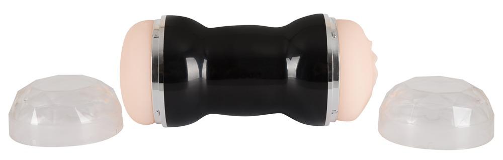 Double the fun!Skin coloured masturbator in a black-silver sleeve. The textured lust tunnel is open at both ends - one end is in the shape of a vagina and the other end is in the shape of an anus. Complete length approx. 20 cm, inner-Ø approx. 4 cm. It is recommended that lubricant is used. Material: TPR, sleeve ABS.