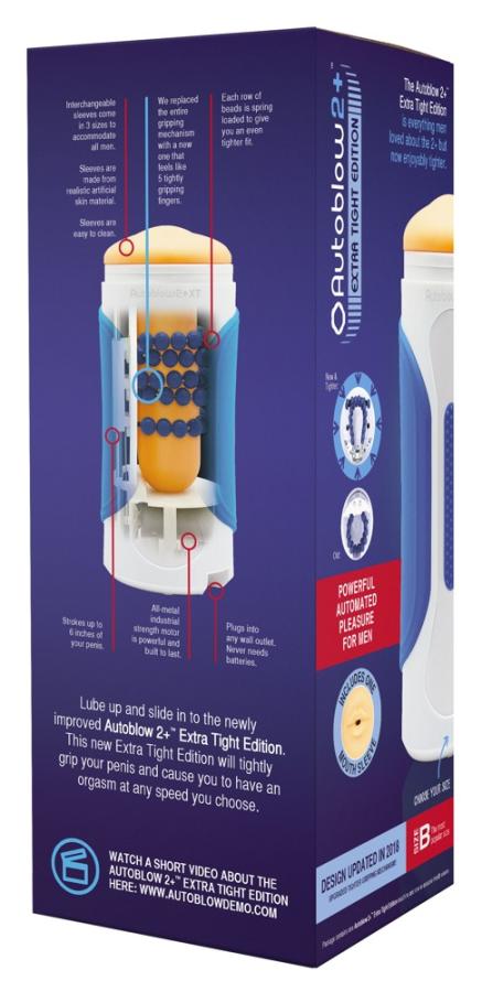 Luxury Blow Job machine for sophisticated men – now in an Extra Tight Edition!There is a motor inside the robust casing, which rhythmically moves the springs up and down. The penis sleeve is inserted into the casing so that the springs are around the sleeve (A: for a penis circumference of 7.5 to 10 cm, B: 10 to 14 cm, C: 14 to 16 cm, sleeves suitable for all lengths).What it has to offer:1. Very powerful & robust industry quality motor2. Multi-speed up and down movement3. Hands-free stimulation4. Realistic sleeve material5. Plug connectionMaterial: TPE, ABS.Please note: it is recommended to use lubricant when inserting the penis into the sleeve.Please note: the Autoblow automatically turns itself off when it gets too hot or there is too much pressure.