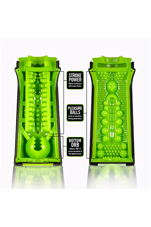 Super soft multi textured orifice with multiple chambers of pleasure. Each chamber providing a unique erotic sensation. Hand grip with pleasure control. Have it as tight as you want it. Cylinder unfolds open for easy clean up. Folds and locks in place for use. Cap it and store away. Sheathed in a soft touch matte black finish.