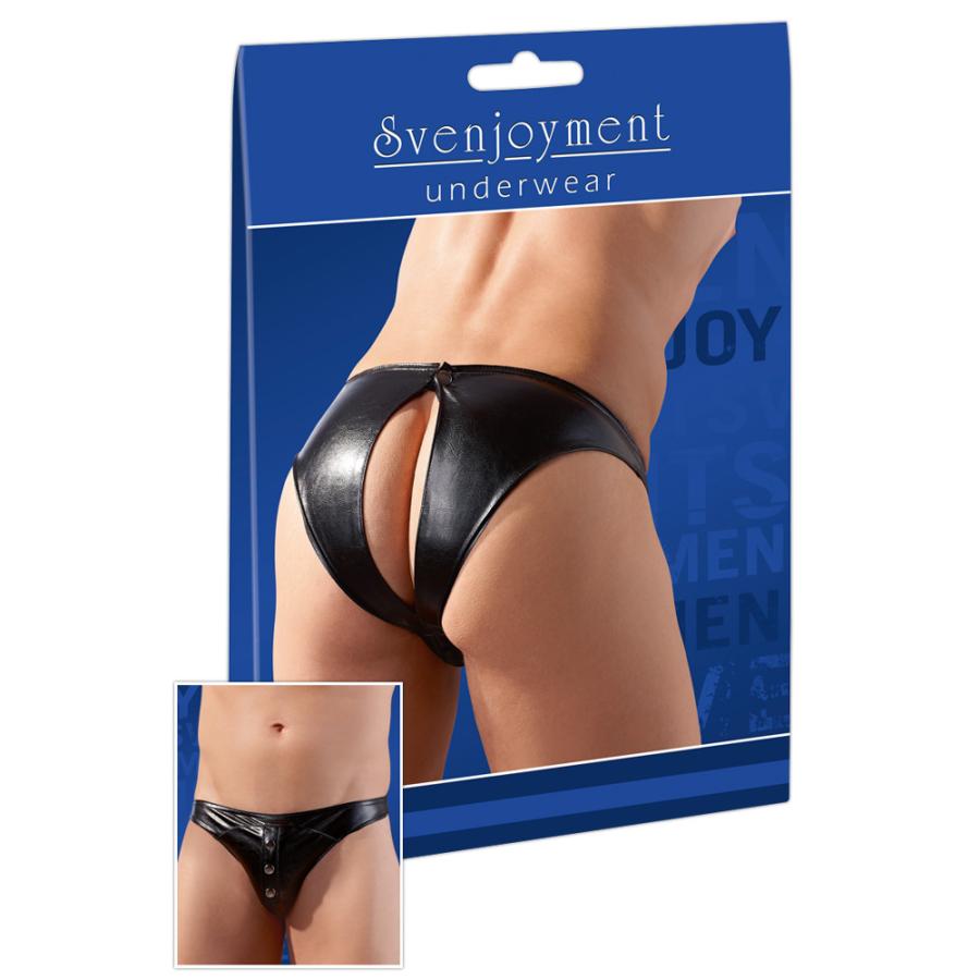 Extremely hot!These stretchy black briefs made out of shiny imitation leather are very sexy, thanks to the press studs over the pouch and the cheeky slit at the back. The slit is held together with one press stud. 98% polyester, 2% elastane with a polyurethane coating.