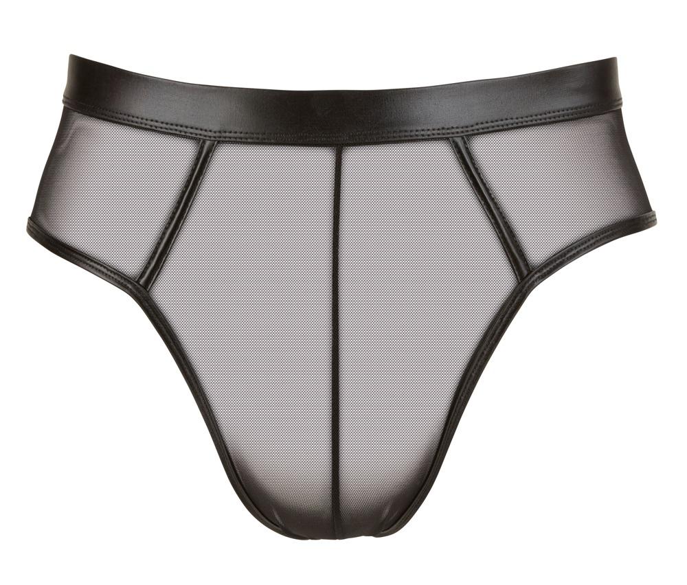 These pants encourage erotic ""caressing""!These incredibly inviting bottomless pants are for men who like presenting their best qualities... The combination of stretchy wetlook material and slightly transparent powernet provides a great view! Black. 90% polyamide, 10% elastane.