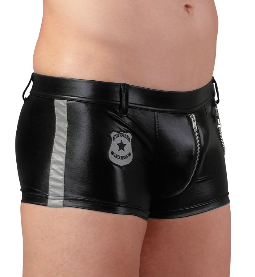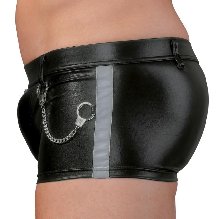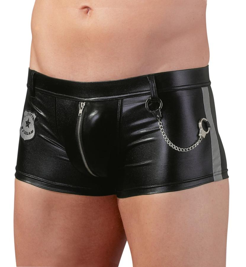 A sexy dominant look!Slip into these black wetlook pants and become a strict policeman. There is a police badge on the right-hand side and you can use the small metal handcuffs on the left-hand side to seductively arrest your partner! With a reflective stripe down each side and belt loops on the waistband. With a zip at the front. 92% polyester, 8% elastane.