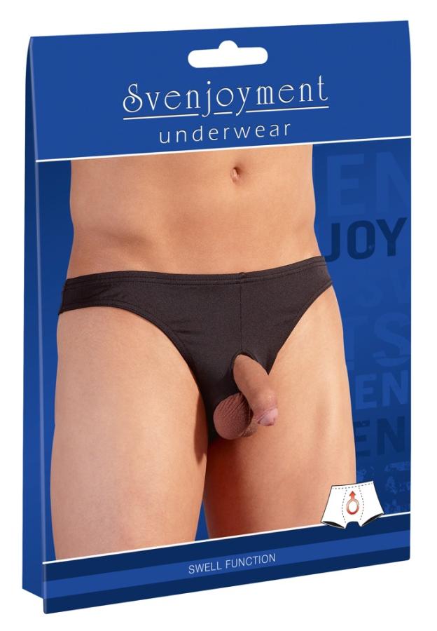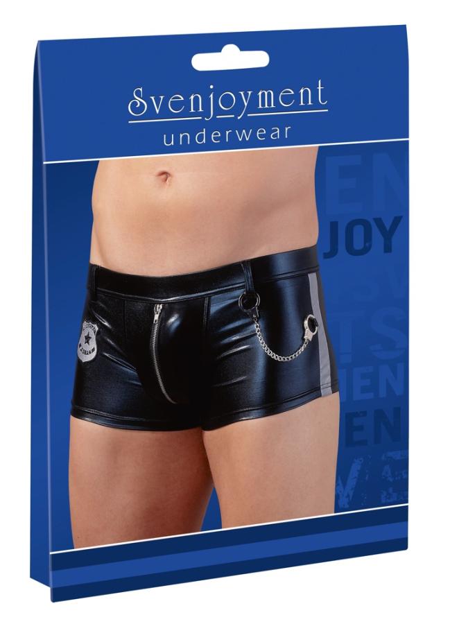 Highly shiny pants with refined buttock-shaping back seam. 2 synthetic zippers in the front on the left and right side of the pouch. Black. 92% polyester, 8% elastane.