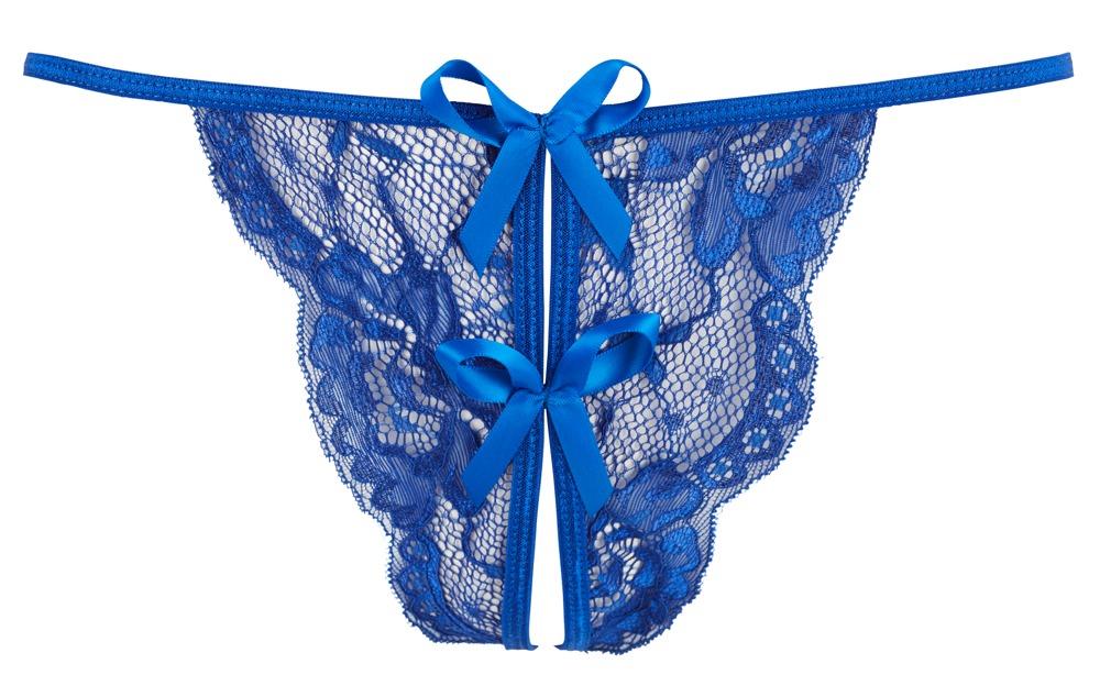 Seductive design in a trendy colour!Blue lace string with stretchy straps at the sides and a seductive open crotch with 2 decorative bows. There are 2 straps that go over the crotch. 90% polyamide, 10% elastane.