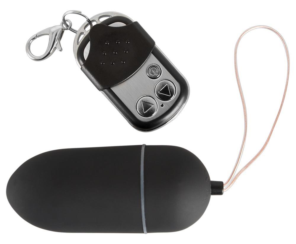 Uovo vibrante nero con maneggevole telecomando piccolo. Portata ca. 6 m. Dieci ritmi di vibrazione. Ca. 8 cm di lunghezza, Ø 3,3 cm. Materiale: ABS con rivestimento PU. Incluse batterie.