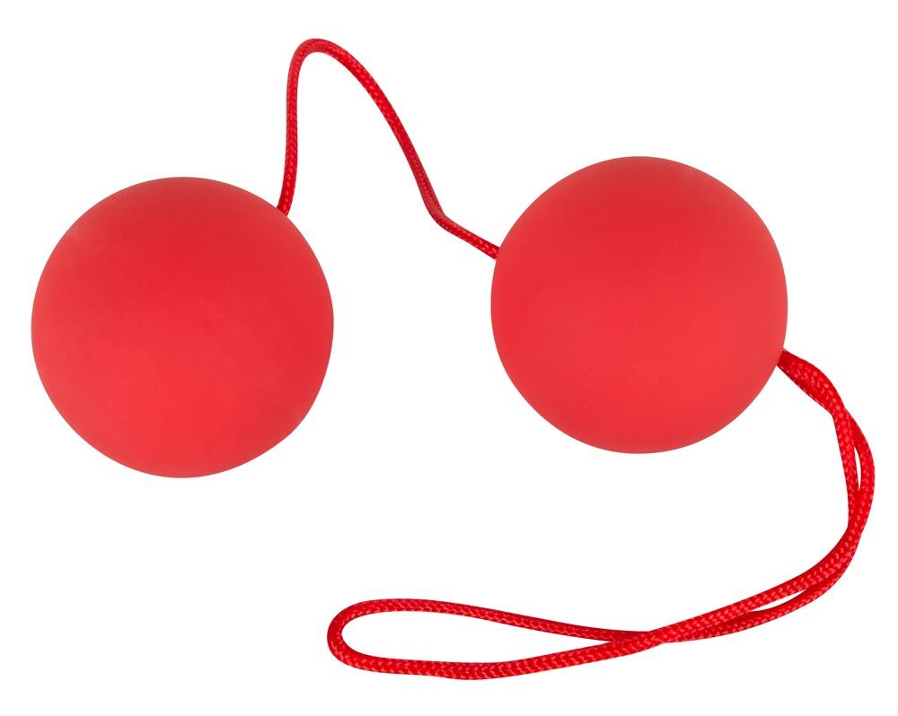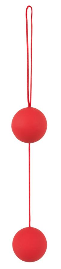 Red love balls with rotating inner balls. The love balls are joined together by a cord. With a retraction loop. Ø 3.5 cm. Material: ABS with a PU coating.