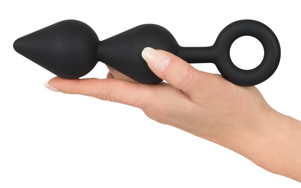 An exciting plug for intense stimulation! This flexible butt plug has a velvety soft touch surface and feels wonderful when it is being inserted into your pleasure zone. Feel the tip of the first droplet gently pushing its way through so that its large body and narrow neck can follow. Once the first droplet is inside, the second one can then follow. The retraction ring makes sure that the plug stays in place and makes removal extremely easy as well. Black Complete length 19.8 cm, insertion depth 12.5 cm, Ø 4.5 cm. Silicone with a PU coating.