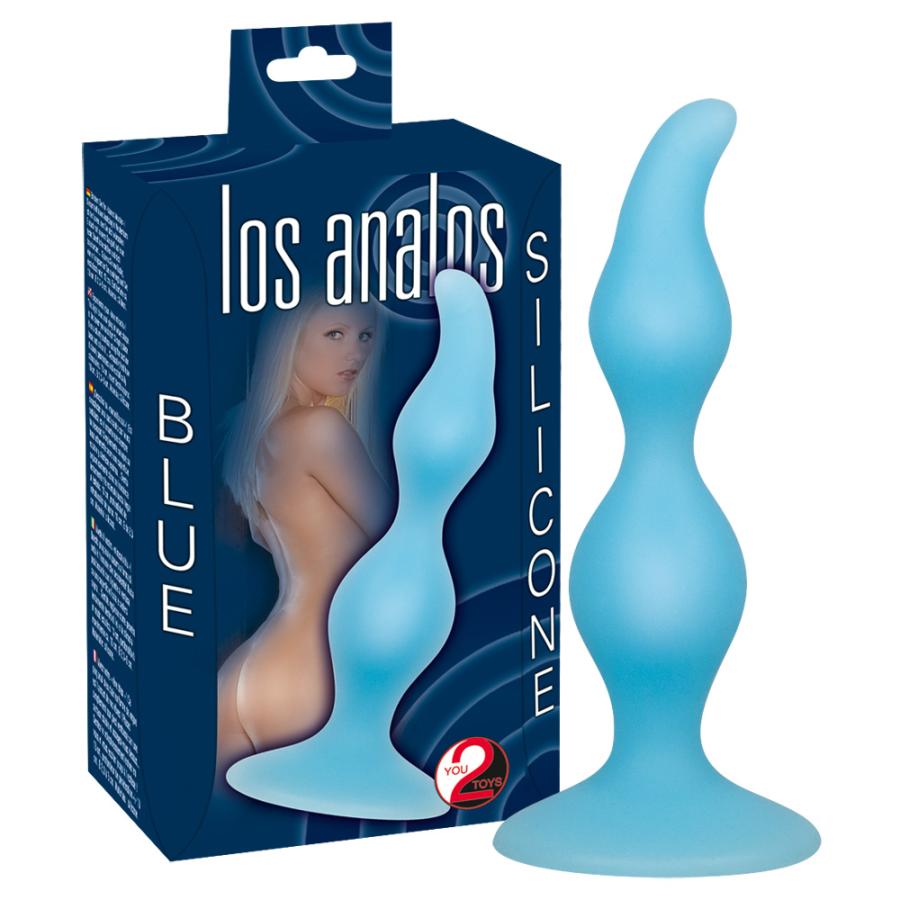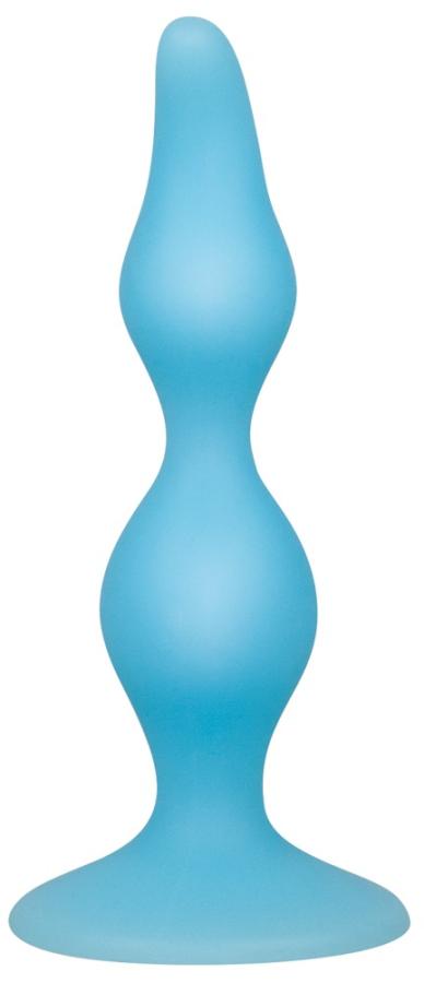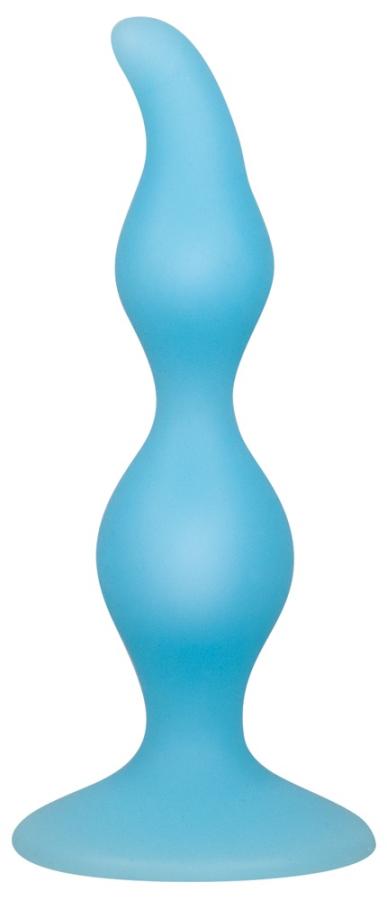 Light blue wave-shaped anal plug with a suction base for max. control. Full size: 13 cm. Penetration depth: 10 cm, 2.3-3 cm diameter. Material: silicone.