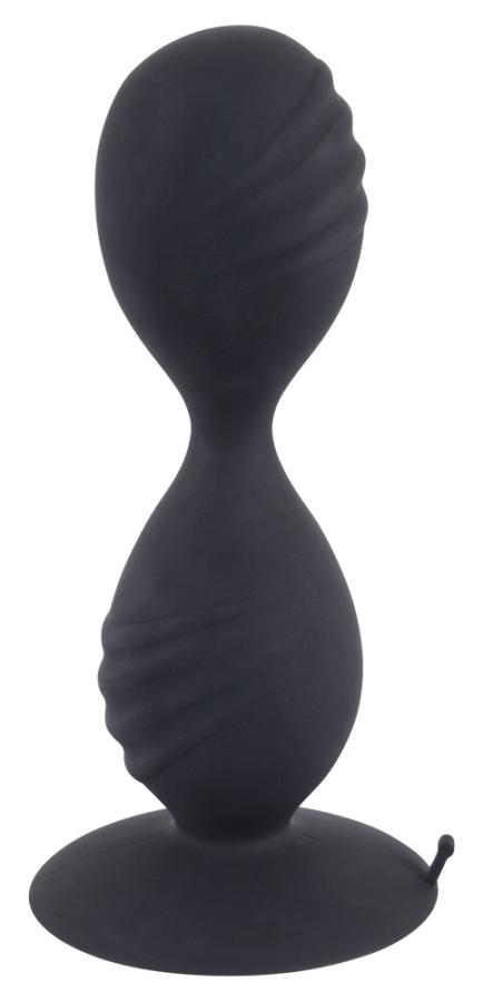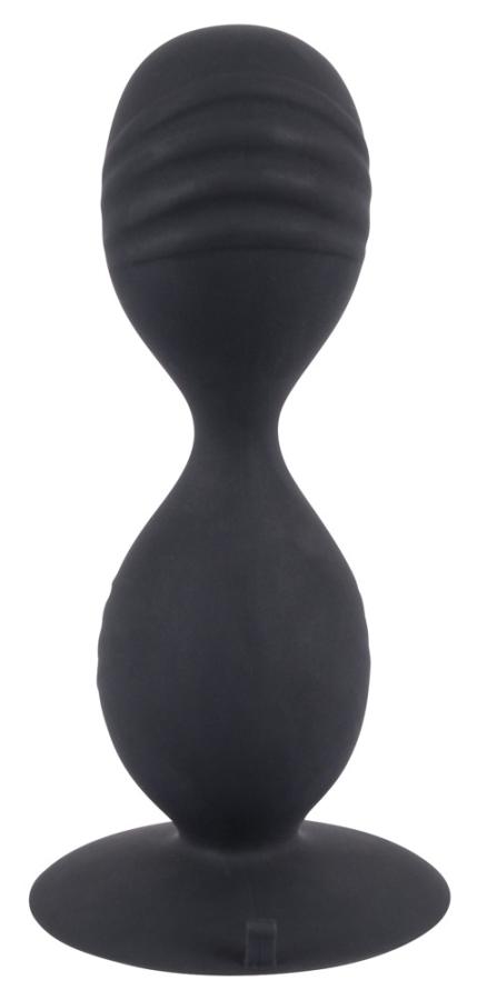 Incredible back door stimulation!Butt plug made up of two balls with stimulating grooves on them. There is a flexible connection bridge between the two balls. There are also two stimulating rotating balls inside. With a suction cup. Black. Complete length 12.5 cm, Ø 3.7 cm. Silicone with a polyurethane coating.